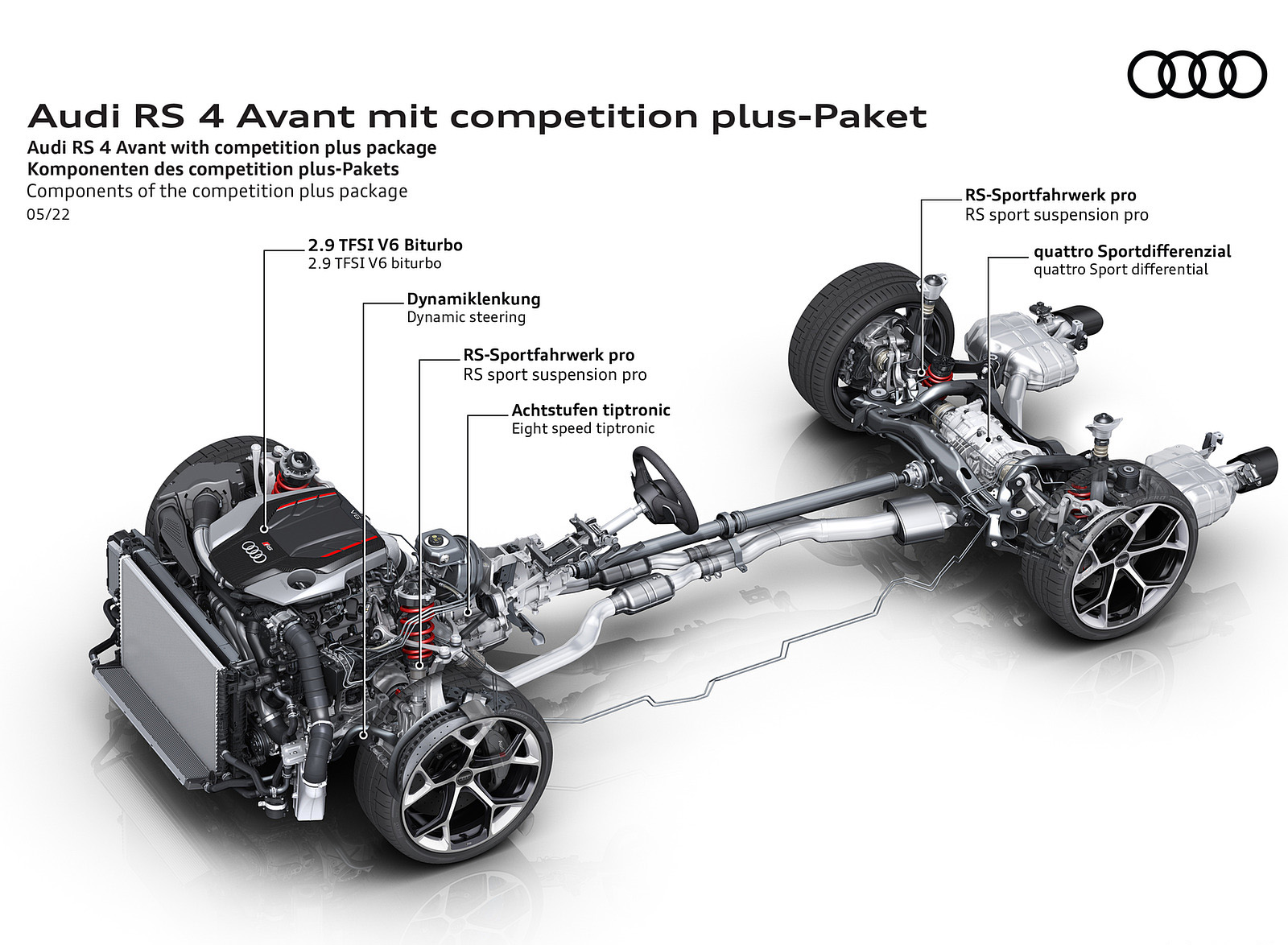 New optional coilover suspension in combination with the more sporty Audi quattro sport differential and Pirelli Corsa P Zero makes for even more intense driving dynamics. The RS sports exhaust system...